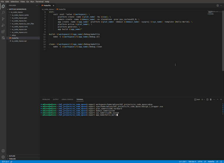 Once VS Code is open, we are going to create a make file which will call XSCT to create the platform. This script can be generic and use variables set in a terminal to define platform, project system names etc.